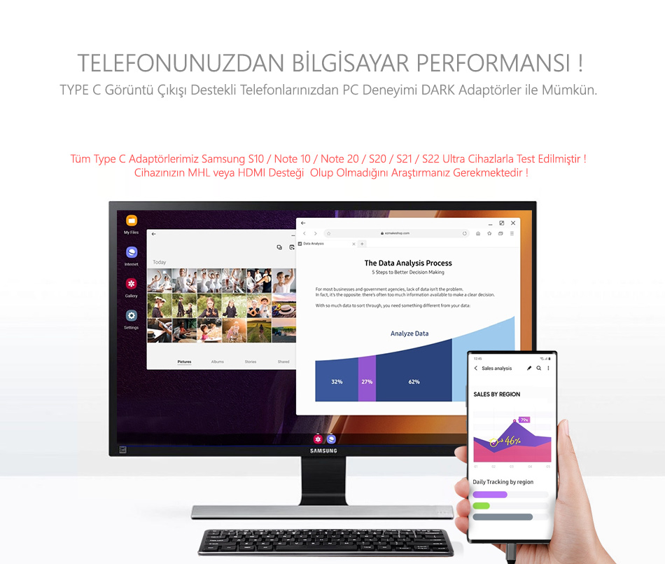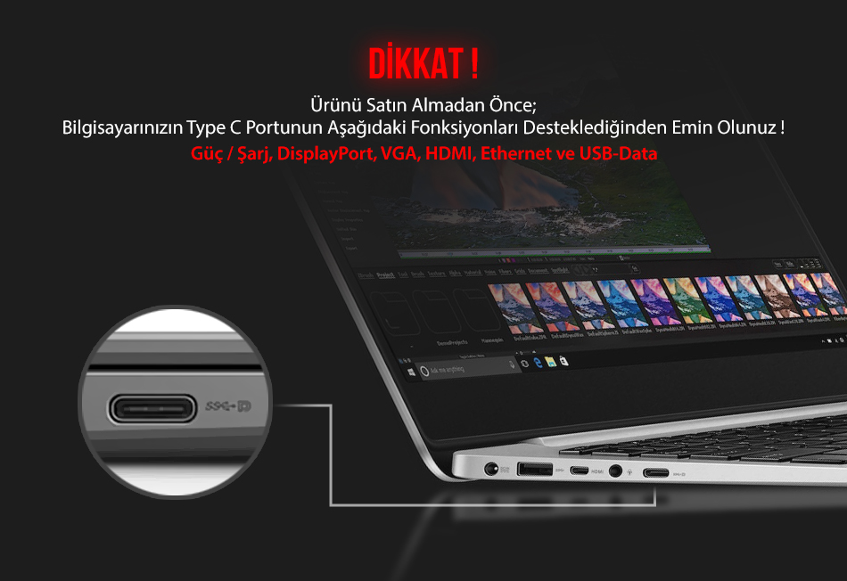 Yeni satın almayı düşündüğünüz Dark USB Type-C dönüştürücü üzerindeki fonksiyonları kullanabilmeniz için öncelikle sahip olduğunuz bilgisayarın Type-C portu üzerinden Güç / Şarj, DisplayPort, HDMI, VGA, Ethernet ve USB Data bağlantısı gibi fonksiyonları desteklediğinden emin olmalısınız. Dönüştürücüyü satın almadan önce lütfen bilgisayarınızın üretici sayfasında bulunan açıklamaları takip ediniz.