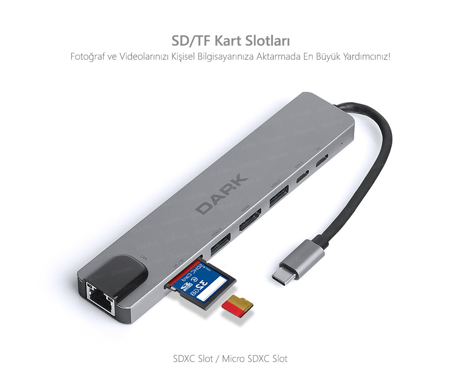 Dark USB C 8 in 1 dönüştürücünün Dahili SD / TF kart okuyucu sayesinde 2TBe kadar microSD / microSDHC / microSDXC / SD / SDHC / SDXC kartlar desteklenmektedir.