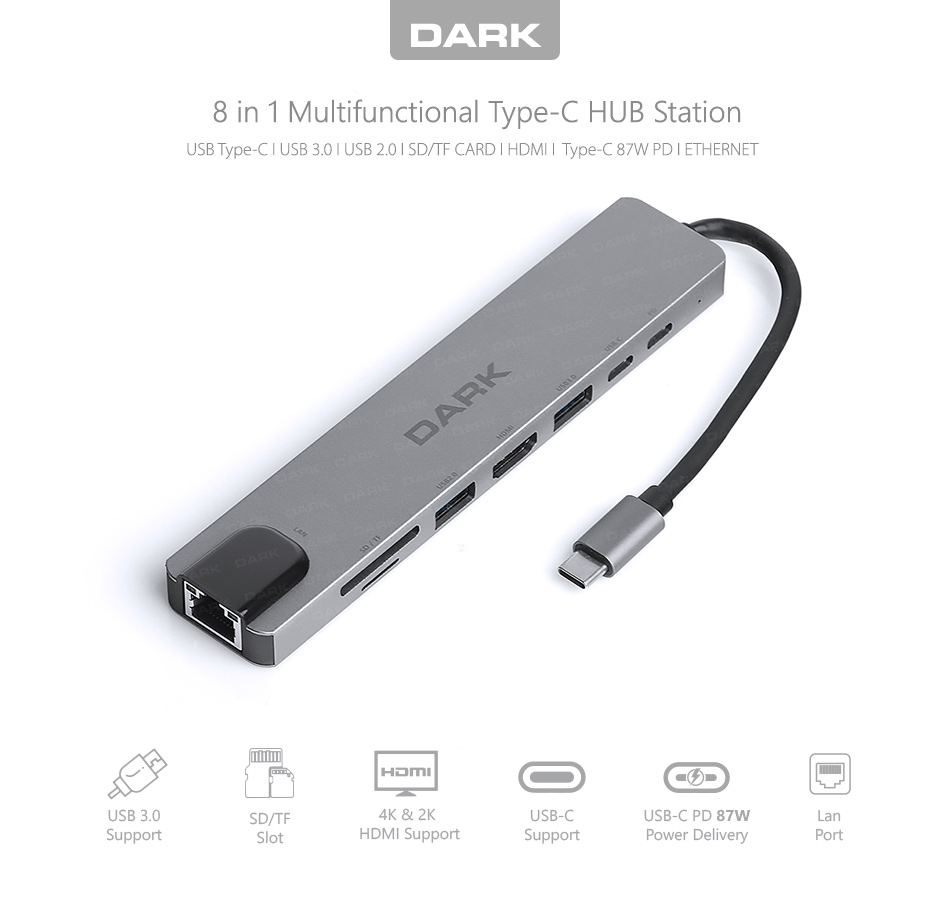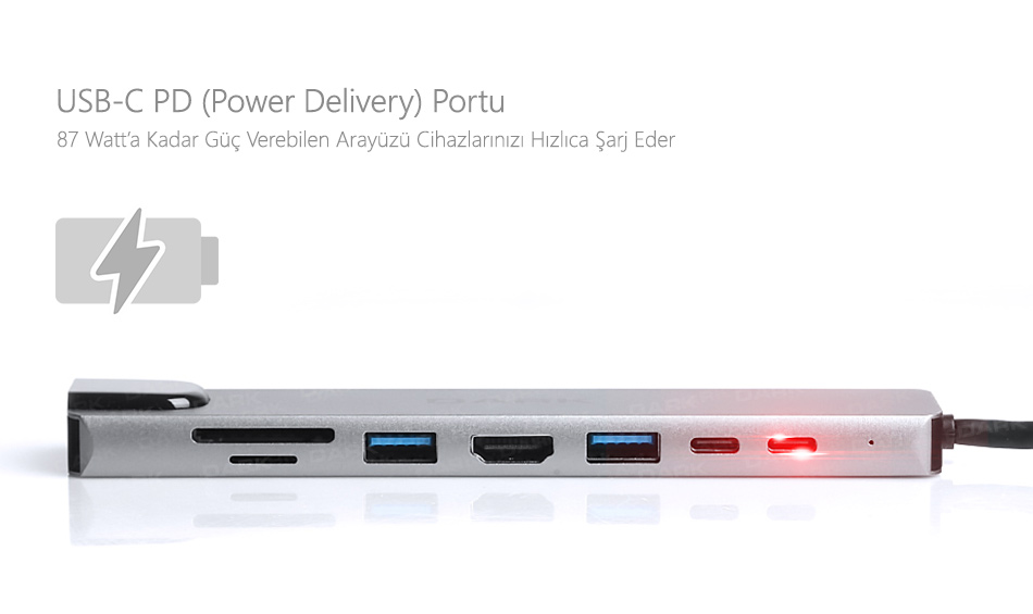 Tek bir USB-C portundan 8 farklı bağlantıya geçmek için Dark U31X40 yeter! 4K@30Hz görüntü için HDMI,dijital depolama ya da klavye/fare desteği için 2 farklı USB bağlantı,tüm SD /TF kartlar için yüksek hızlı kart okuyucu ve tüm bu özellikler ile çalışırken cihazınızı hızlıca şarj etmenizi sağlayacak 87W USB-C PD şarj bağlantısı Dark U31X40 ile bir arada!