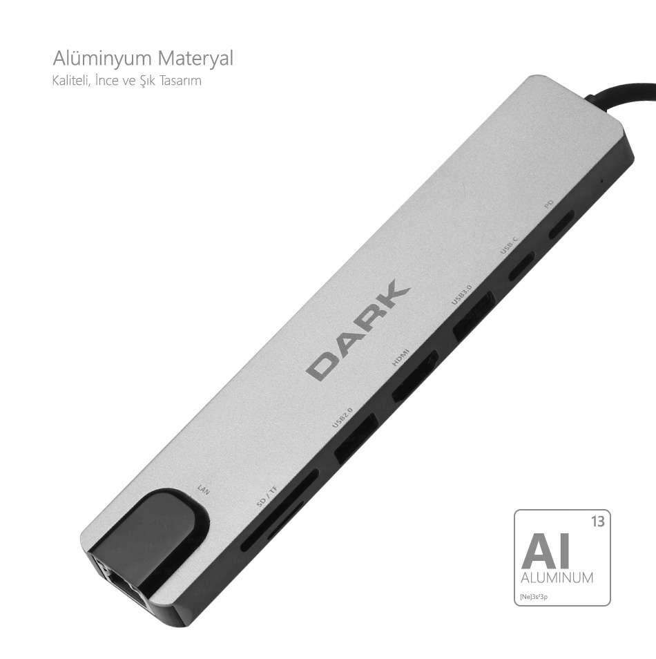 Dark USB-C 8 in 1 dönüştürücü yüksek kaliteli alüminyum alaşım kaplamaya sahiptir. Alüminyum alaşım, başlık ve dönüştürücünün ana gövdesinde yüksek koruma sağlarken yumuşak hatlı çizgilere sahip tasarımı şık ve zarif bir görünüm sunar.
