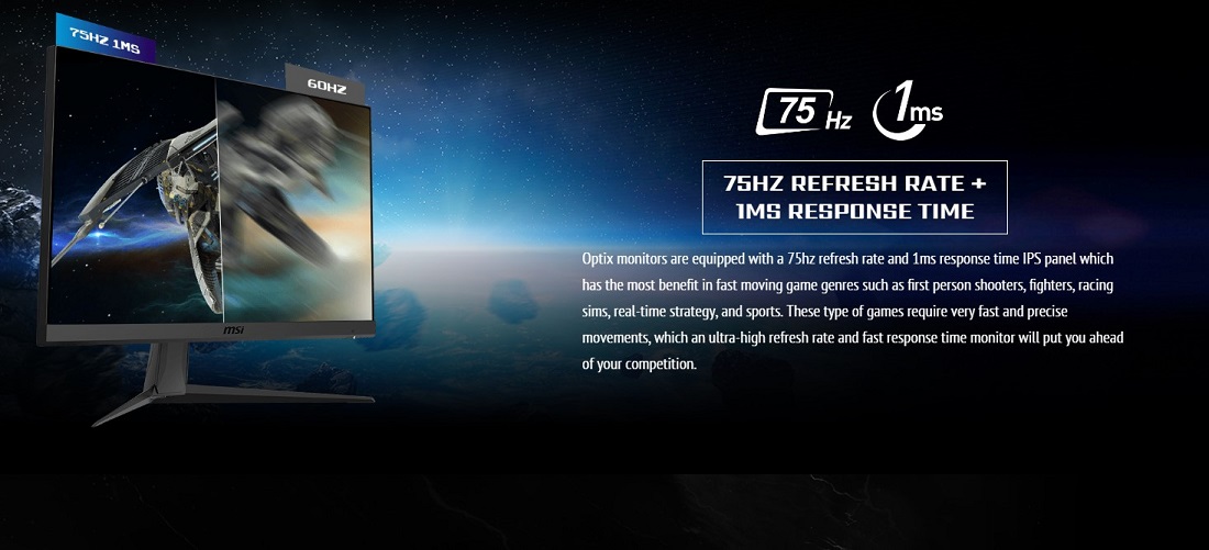 OPTIX G241V E2, 75Hz tazeleme oranı ve 1ms tepki süresine sahip IPS paneli ile savaş, FPS, yarış simülatörleri, gerçek zamanlı strateji ve spor gibi birçok hızlı akan oyun türünde büyük avantaj sağlar. Ultra yüksek tazeleme oranı ve hızlı tepki süresi sizi oyunda rakiplerinizin önüne geçirir.